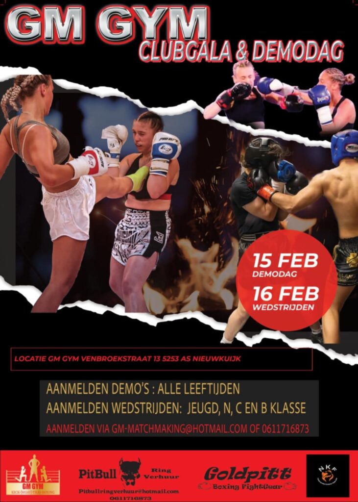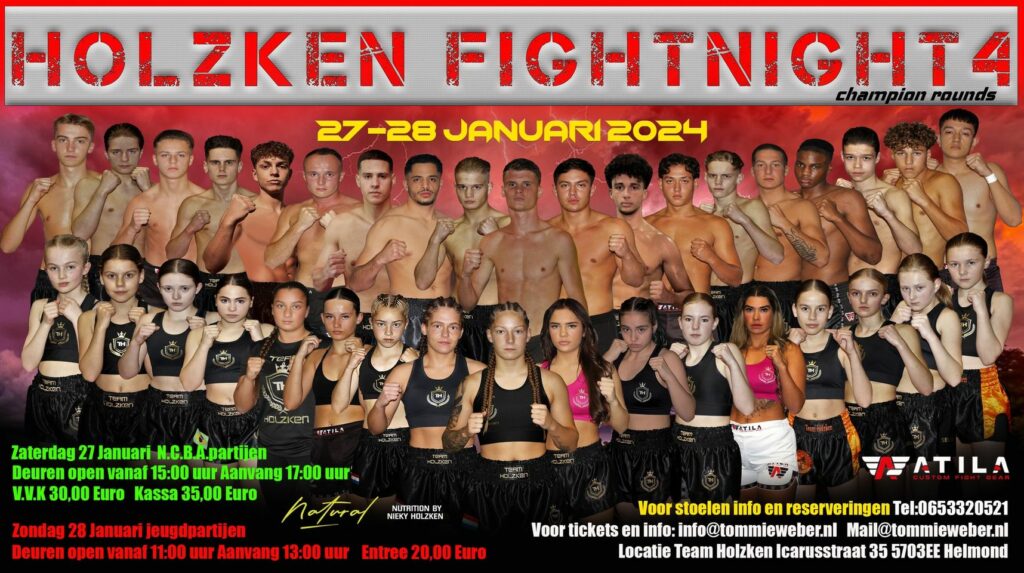 Zondag 28 januari nemen we deel aan het gala van team Holzken in Helmond. Voor nu zijn er vier jeugdvechters gematcht. Abdessalam Oualit, Rishi Narain, Yélina Jasperse en Faylin Koolmees. Er zijn meer vechters aangemeld dus wie weet volgen er nog meer. Kaarten kosten 20 euro in de voorverkoop en 25 euro aan de deur. Geef dus op tijd door dat je mee wilt zodat we voldoende kaarten hebben en we de vechters kunnen aanmoedigen. Stay tuned voor updates!