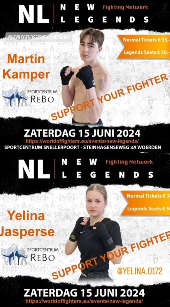 Zaterdag 15 juni zullen Yélina Jasperse en Martin de Kamper uitkomen voor ReBo op het eerste gala van New Legends Fighting Network. Tribune kaarten kosten 35 euro per stuk en zijn verkrijgbaar via de site van het gala. Beide vechters zullen in de middag hun partij draaien.